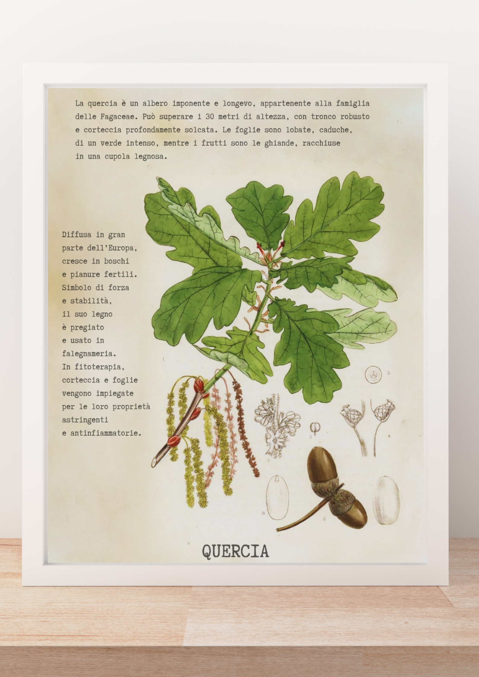 Albero maestoso e longevo, appartenente alla famiglia delle Fagaceae. Diffusa in tutta Europa, la quercia è simbolo di forza e resistenza. Si distingue per la corteccia spessa e rugosa, le foglie lobate e i frutti: le ghiande.